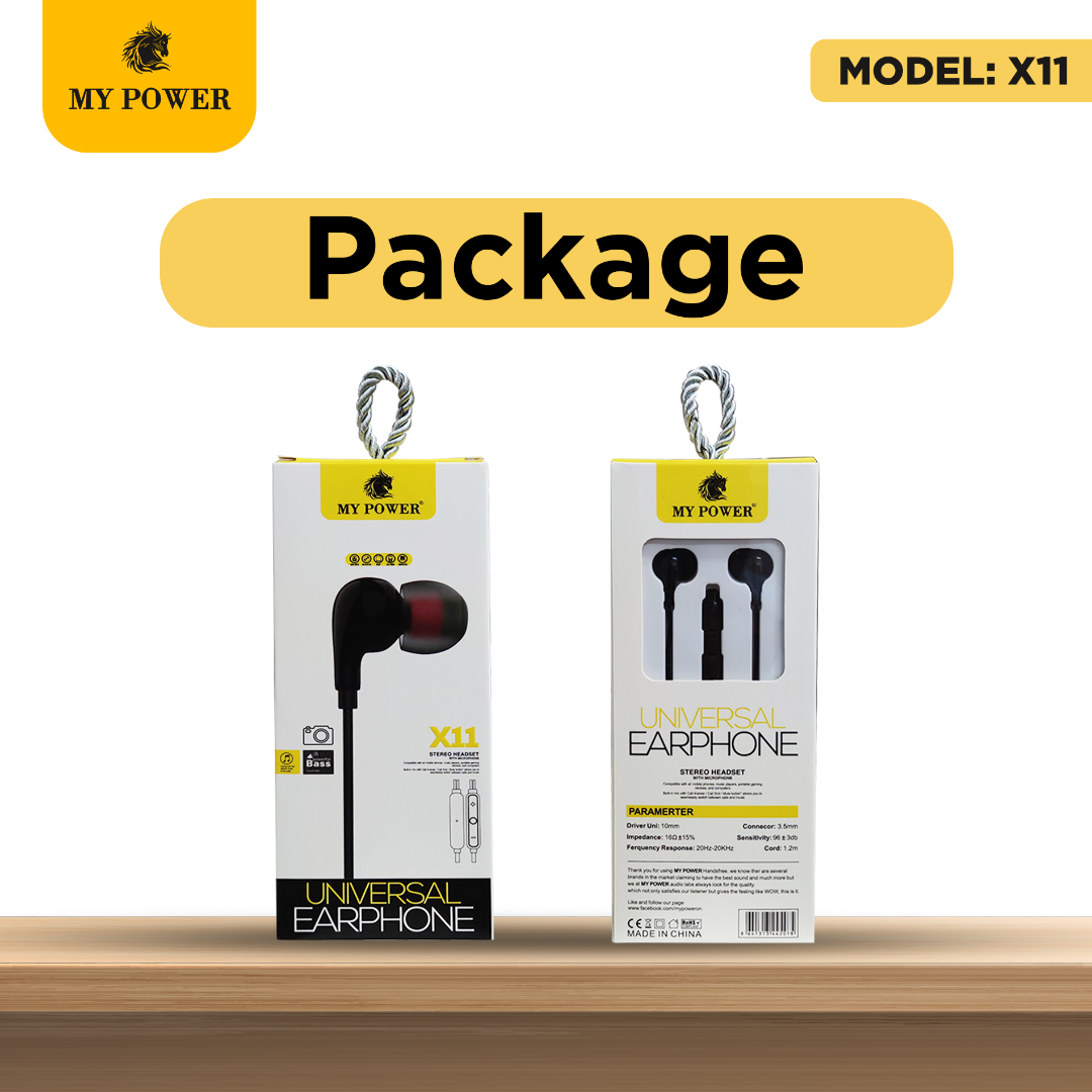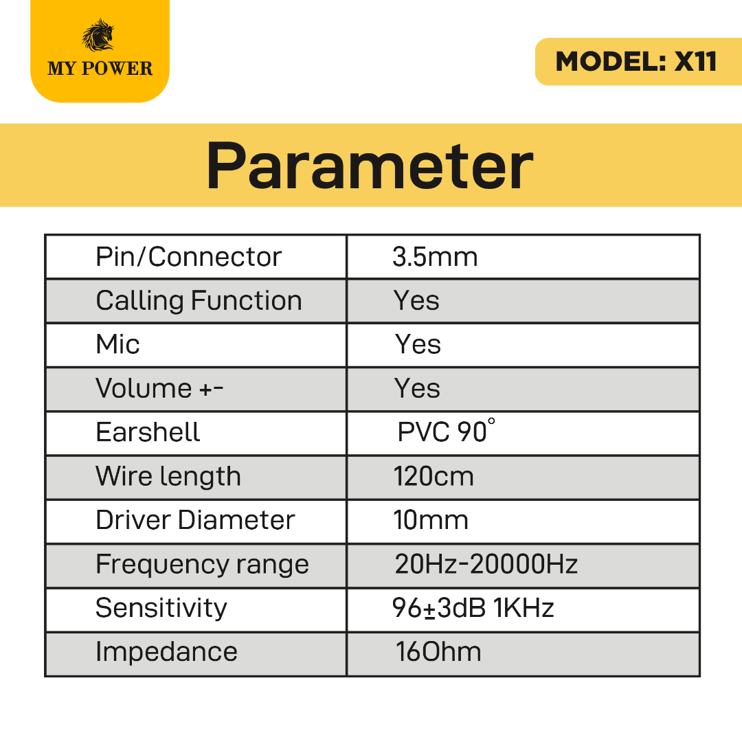 Model no-x11, ABS body, High bass stereo sound, Mic, play pause key, volume function, next previous key, Perfumed, 3.5mm jack, 1.2 mtr wire length, Selfie function with volume key